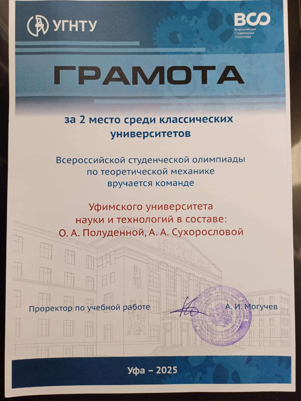 21 ноября состоялось награждение участников финального тура 45-ой Всероссийской студенческой олимпиады с международным участием по Теоретической механике, которая проходила в УГНТУ г. Уфа с 17 по 21 ноября. УУНиТ на этой олимпиаде представляла команда студенток второго курса Физико-технического института: Полуденная Олеся, Сухорослова Анастасия. Руководителями команды были профессор кафедры Теоретической физики (ТФ) Екомасов Е.Г. и ассистент кафедры ТФ Филиппов М. А. Наши студентки получили возможность принять участие в финальном туре олимпиады только после победы в отборочном туре, который проходил также в УГНТУ 6 ноября и в ктотором принимало участие 85 студентов из Уфы и Башкирии.