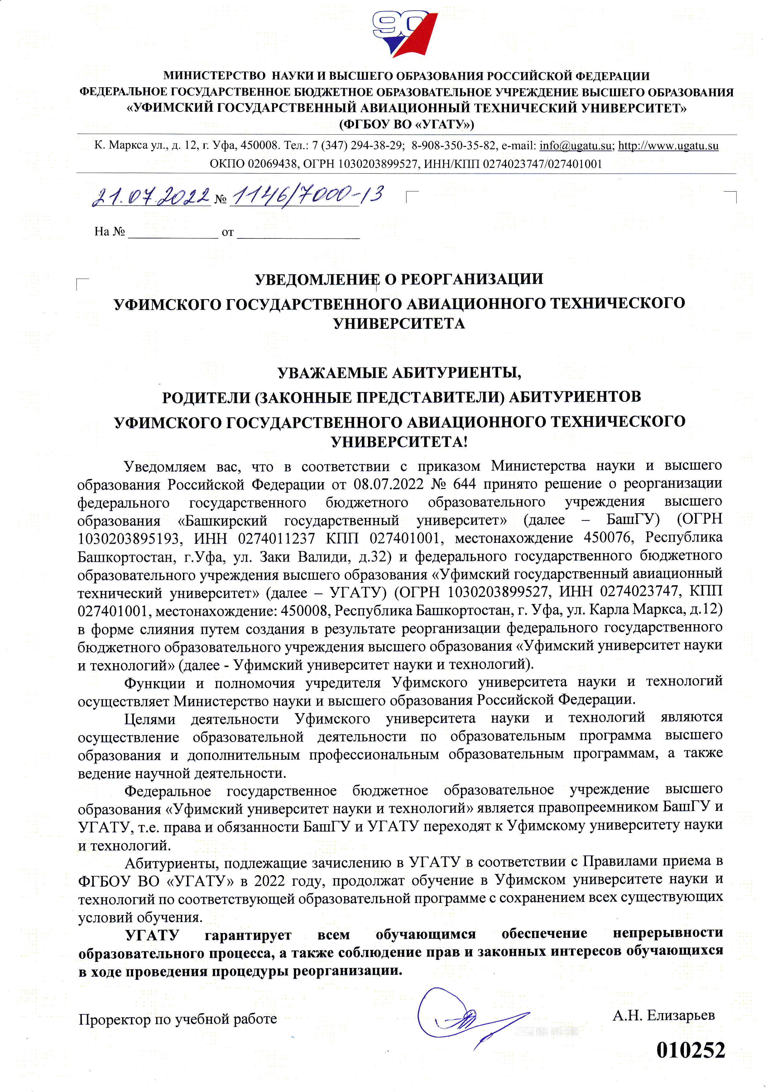 Башкирский государственный университет гарантирует всем обучающимся обеспечение непрерывности образовательного процесса, а также соблюдение прав и законных интересов обучающихся в ходе проведения процедуры реорганизации.