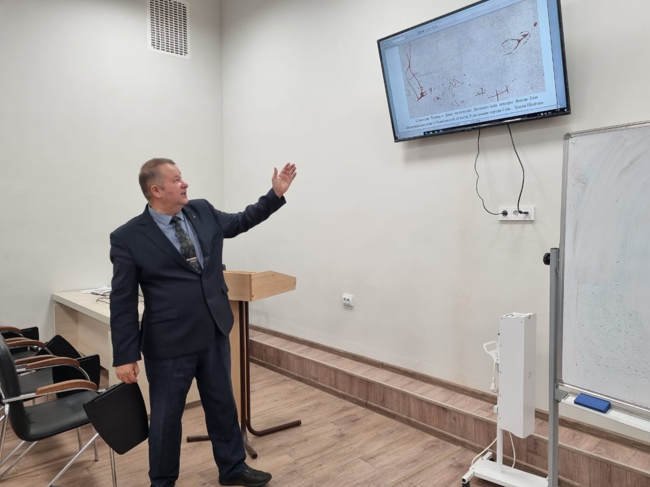 Далее Айрат Багаутдинов познакомил школьников с миром академической науки и рассказал о деятельности научной лаборатории «Семиотические исследования». Одним из успешных результатов деятельности лаборатории является дешифровка древних знаков на стенах пещер Шульган-Таш Башкортостана и Игнатиевская Челябинской области. Гости ознакомились с гипотезой древнего солнечного и лунного календарей на стенах пещеры Шульган-Таш. Школьники с большим интересом рассматривали демонстрируемые на слайдах рисунки мамонтов, шерстистого носорога и лошадей. Ребята задавали вопросы и узнавали много нового для себя о первобытном искусстве.