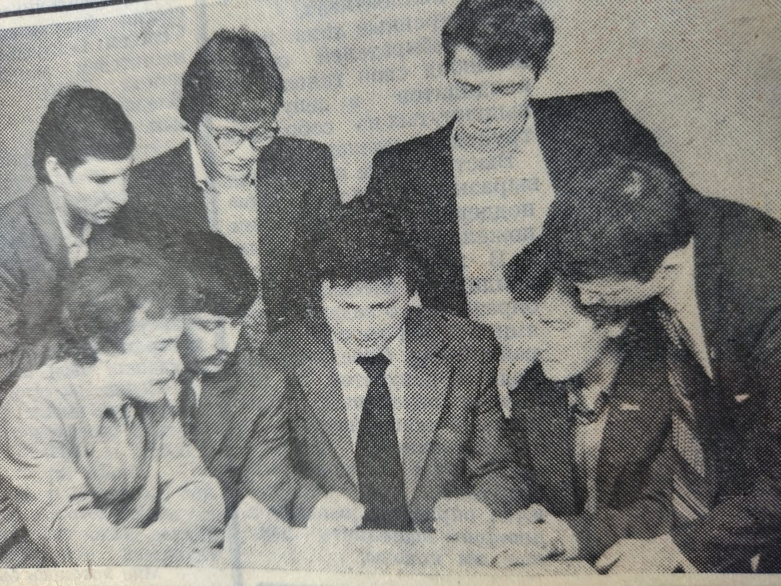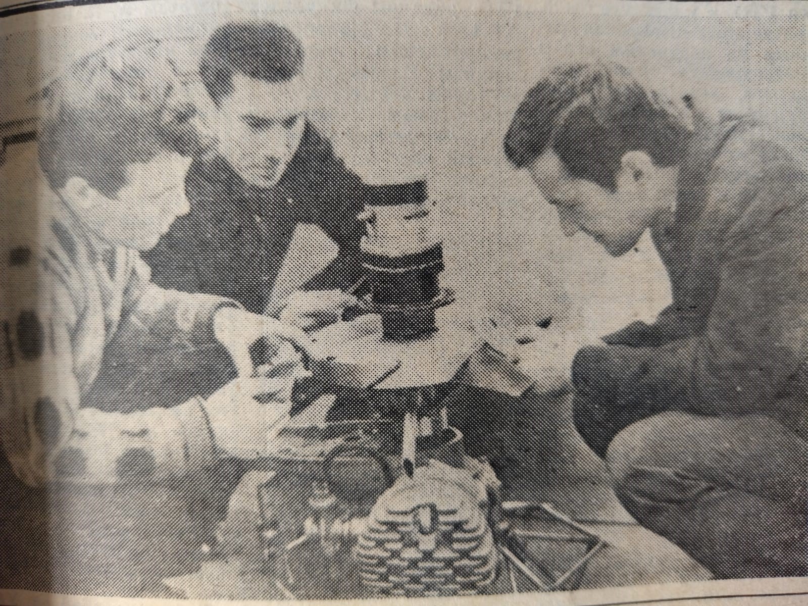 Рабочий момент в студенческом конструкторском бюро №1 УАИ. Ф.Петков, Г.Еникеев, С.Комаров у разработки подъемной системы аппарата на воздушной подушке (фото 1968 года.)
