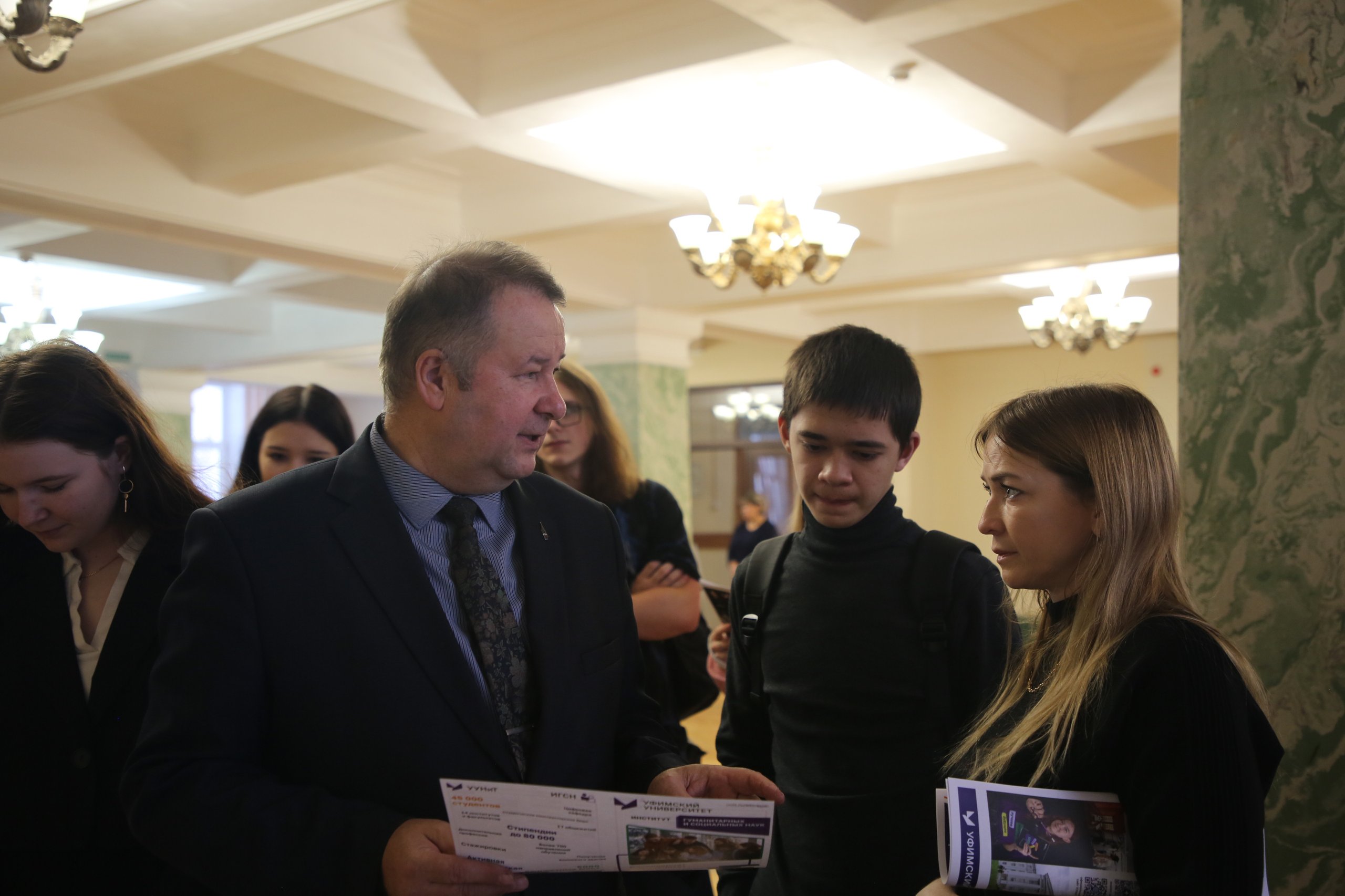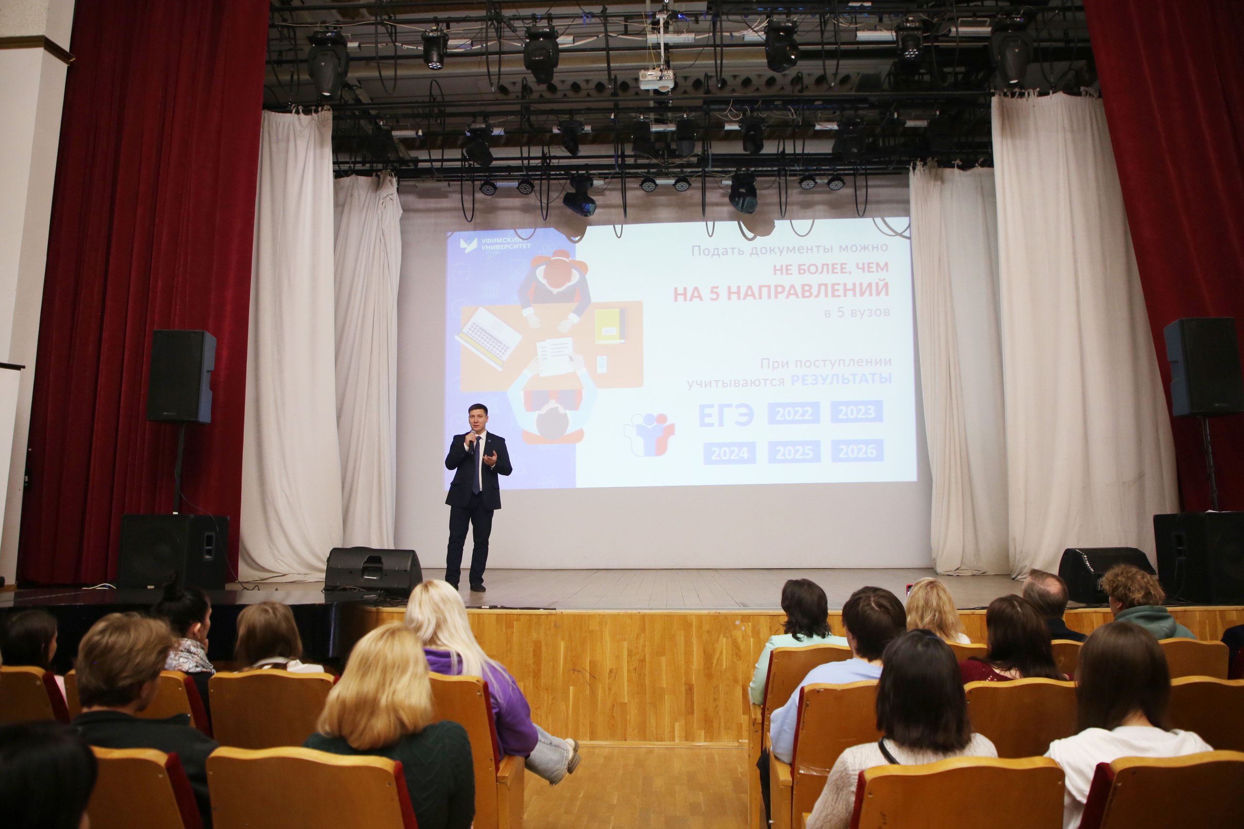 Кроме того, в актовом зале с презентацией возможностей университета и преимуществах обучения в нём выступил проректор по образовательной деятельности УУНиТ Ильгиз Кызыргулов. О правилах и особенностях приёма на 2026 год проинформировал заместитель начальника Управления по работе с абитуриентами Радик Калимуллин.