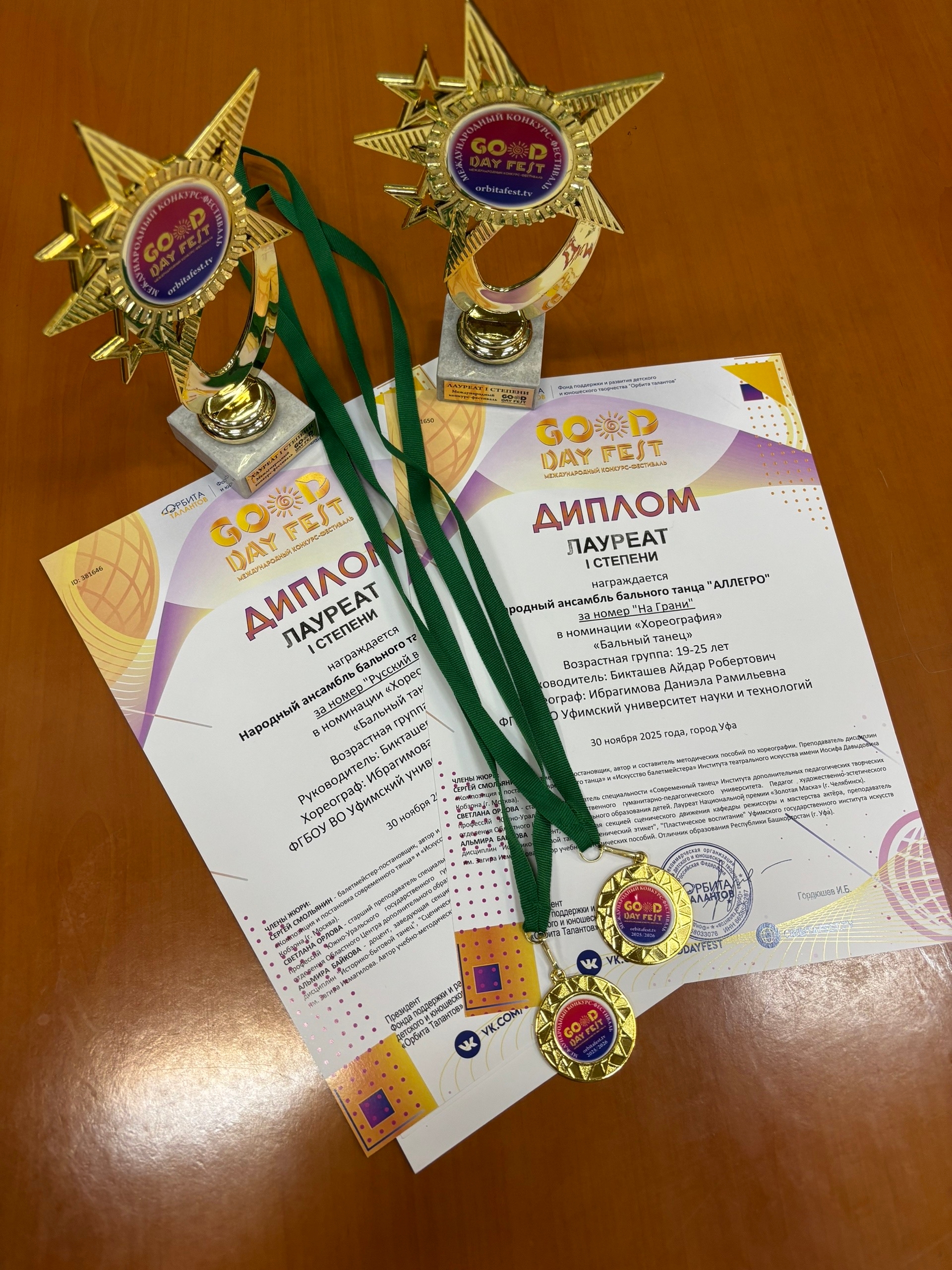 Сразу в двух номинациях Международного многожанрового конкурса-фестиваля детского, юношеского и взрослого творчества "Good day fest" стал лучшим Народный ансамбль танца "Аллегро" Уфимского университета науки и технологий. За два номера: "Русский вальс" и латиноамериканский микс "На грани" талантливый коллектив УУНиТ отмечен дипломами Лауреатов I степени.