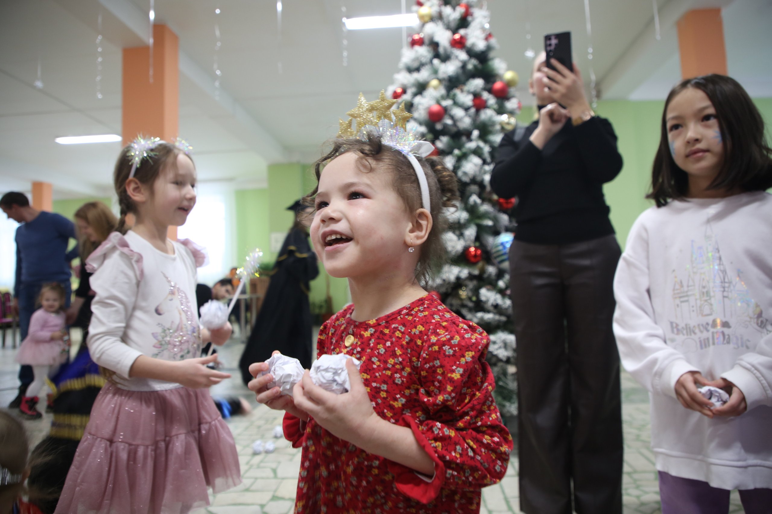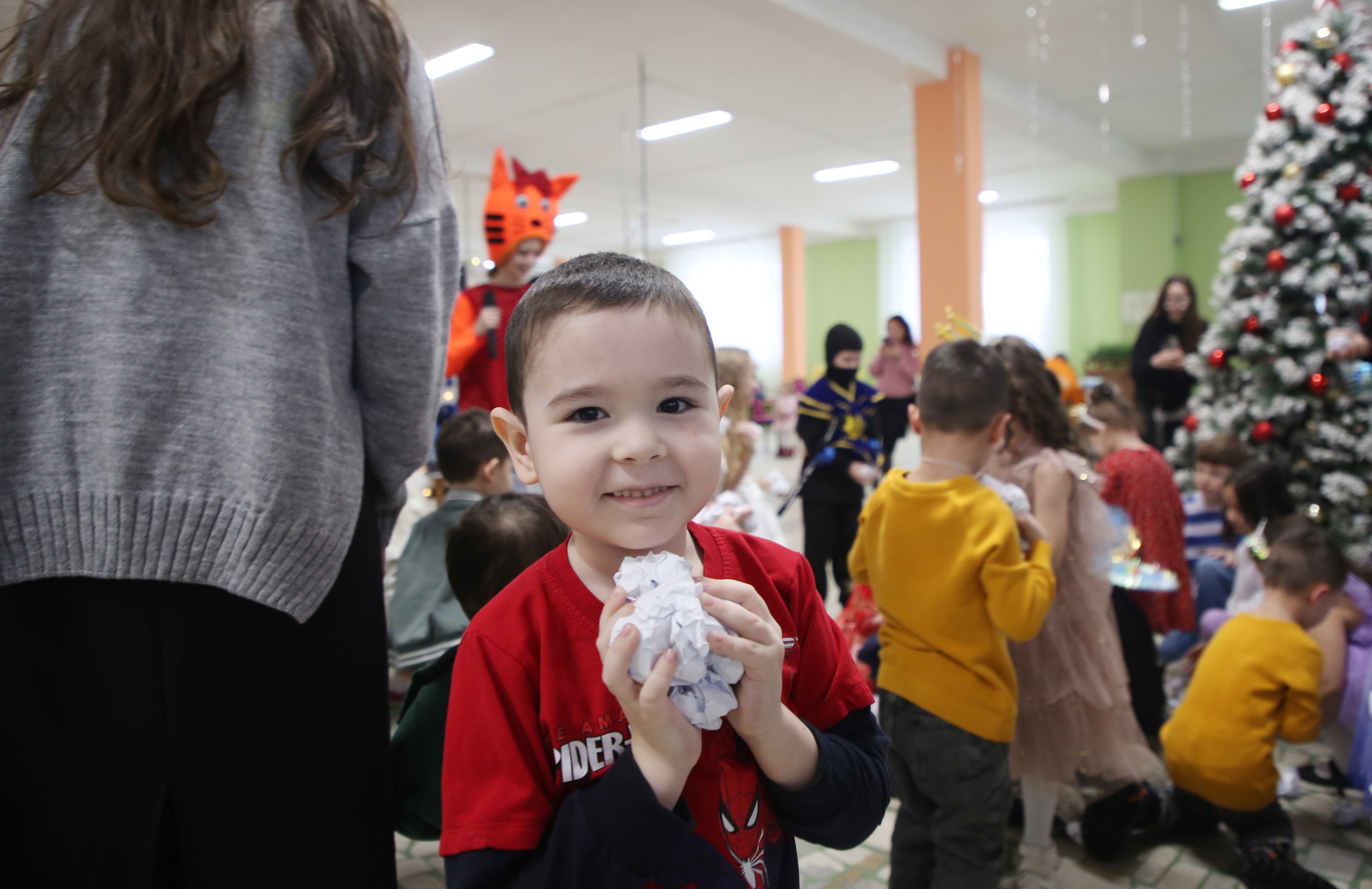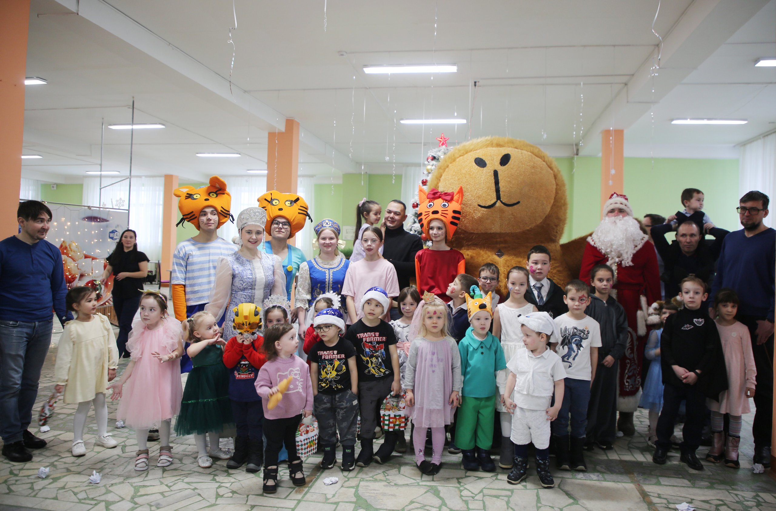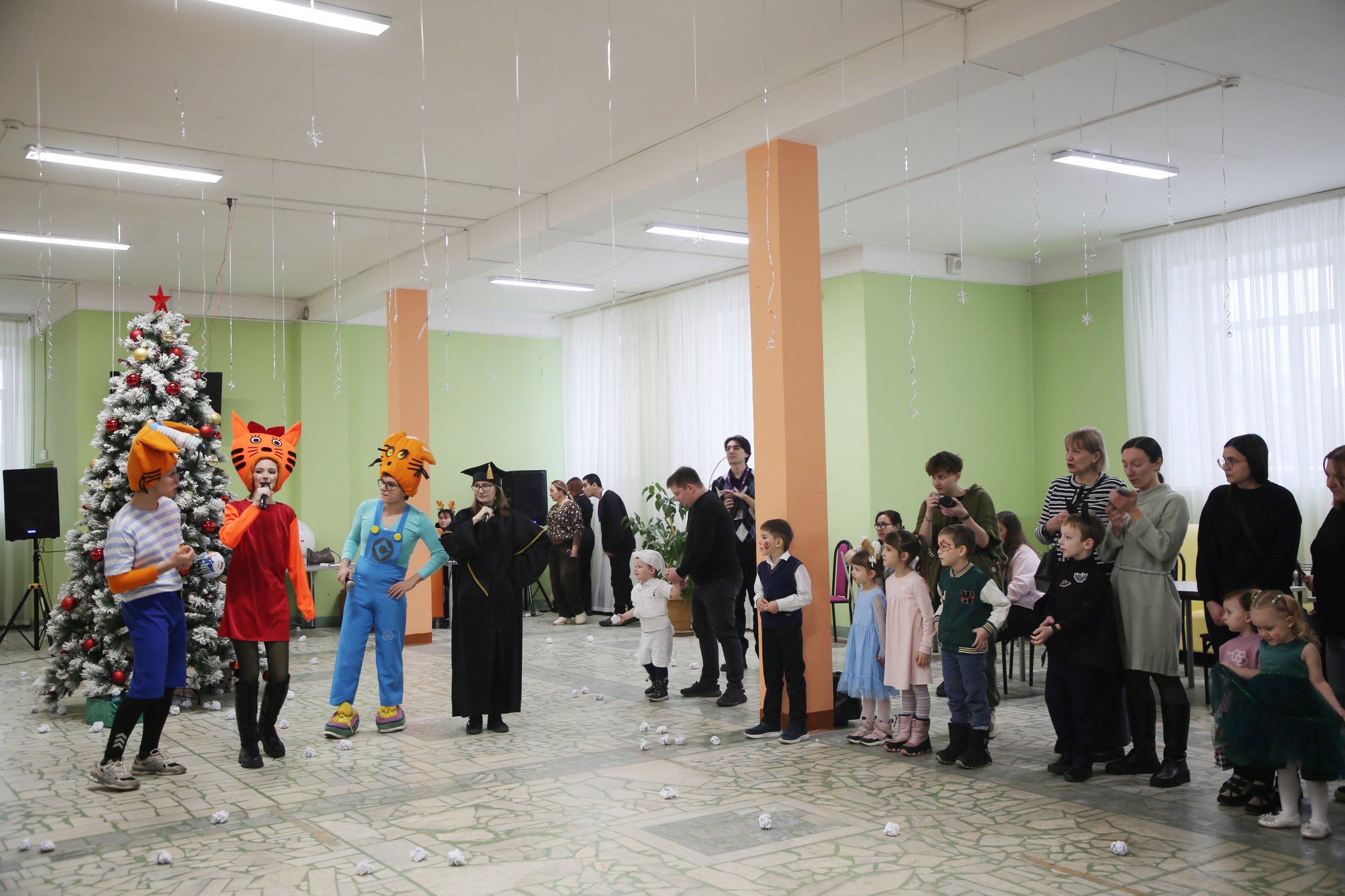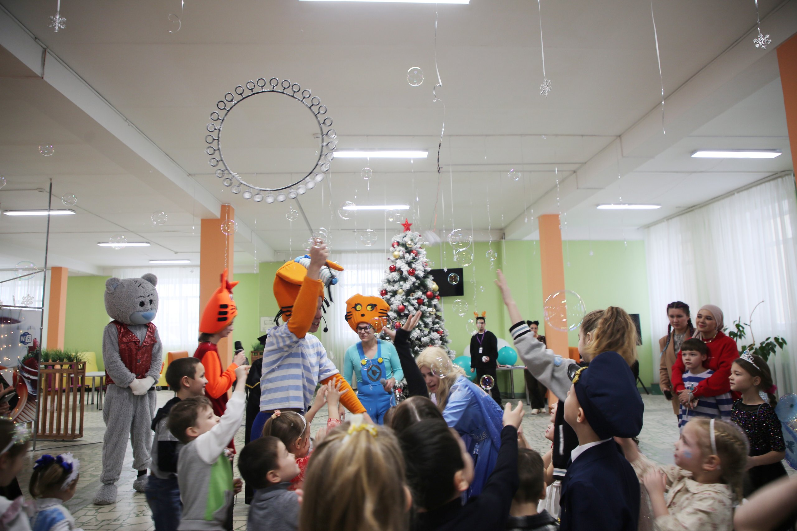 Первым поприветствовал всех собравшихся ведущий Всезнайка, затем к нему присоединились известные персонажи из мультфильма «Три кота» – Карамелька, Коржик и Компот, а также мишка Тедди, Дед Мороз со Снегурочкой и Капибара. Дети с радостью встречали своих любимых героев, которые предложили ребятам множество развлечений, танцы и хороводы вокруг елки под веселую музыку. Особый восторг вызвало шоу мыльных пузырей и игра в «снежки», где дети и взрослые соревновались в ловкости.