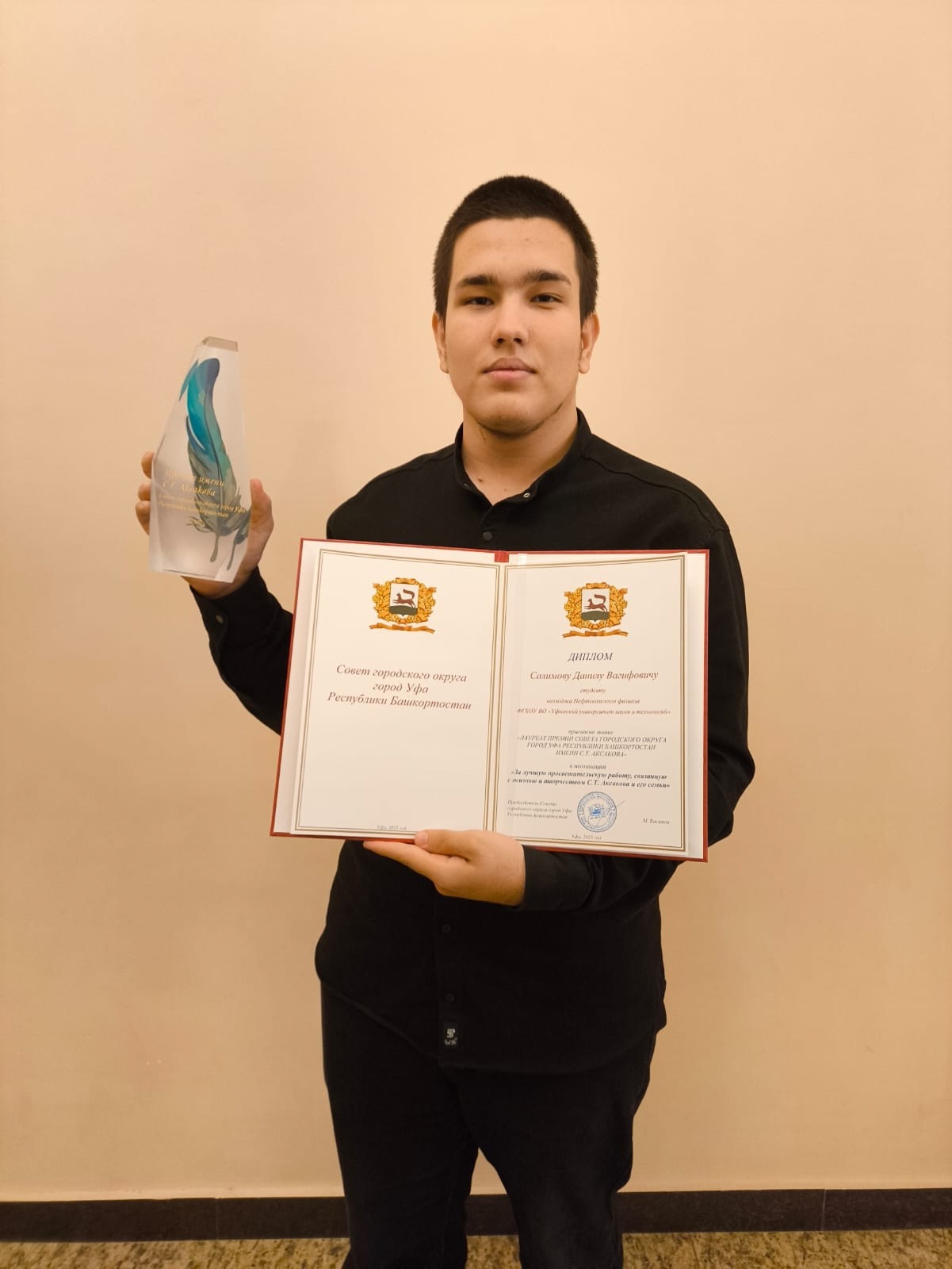 В Башкирском государственном театре оперы и балета состоялось награждение лауреатов Премии Горсовета Уфы имени Сергея Тимофеевича Аксакова. Данная премия проводится ежегодно, с целью популяризация творчества Аксакова, воспитание на богатом аксаковском наследии любознательной, креативной молодежи. В этом году лауреатами Премии стали 19 студентов, среди которых обучающиеся колледжа Нефтекамского филиала УУНиТ специальности «Информационные системы и программирование» Данил Салимов и Аскар Имамутдинов.