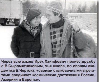 Свою книгу «100 рассказов о стыковке» основоположник космической стыковочной техники подписал так: «Моему старому другу и соратнику Иреку Хайруллину на добрую память о том славном времени, когда мы были молодыми и делали большие дела на Земле и в Космосе».