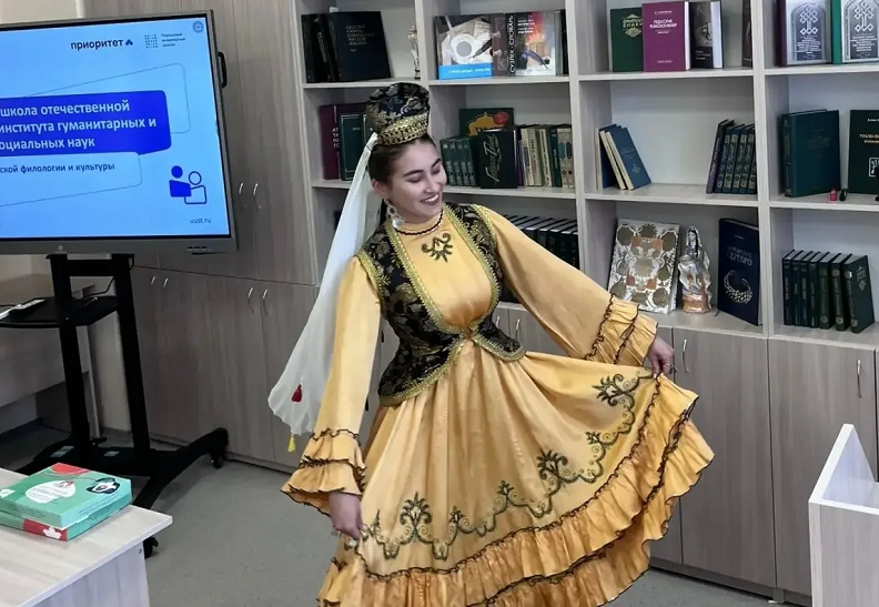 Гости посетили кафедру татарской филологии и культуры Высшей школы отечественной филологии ИГСН, где их сердечно приветствовали преподаватели и студенты. Азалия Гильметдинова исполнила национальный танец, продемонстрировав всю прелесть и самобытность традиций, а Камилла Шайхутдинова проникновенно прочла стихотворение на родном языке. Оба выступления вызвали искреннее восхищение аудитории.