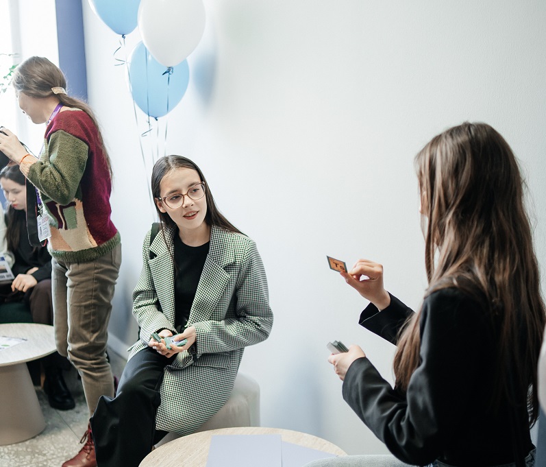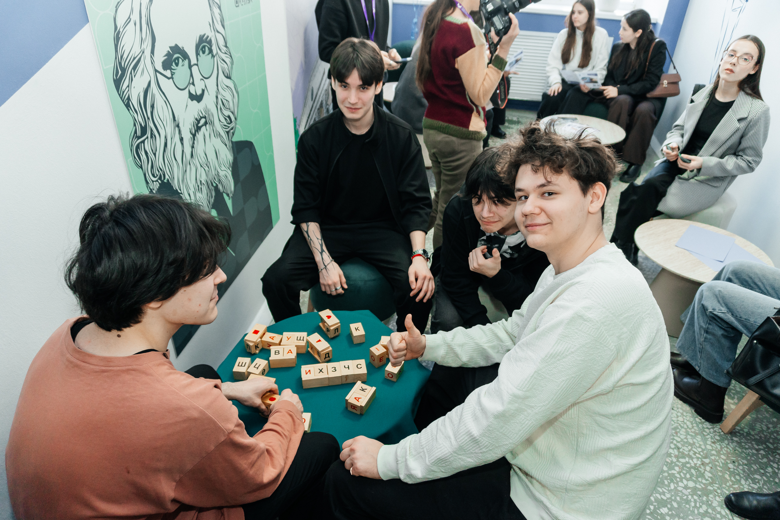 Просторная зона отдыха, оборудованная удобными креслами и яркими зелеными и белыми элементами декора, сразу привлекла внимание студентов. Здесь создана приятная атмосфера для расслабления, общения и творческих обсуждений.