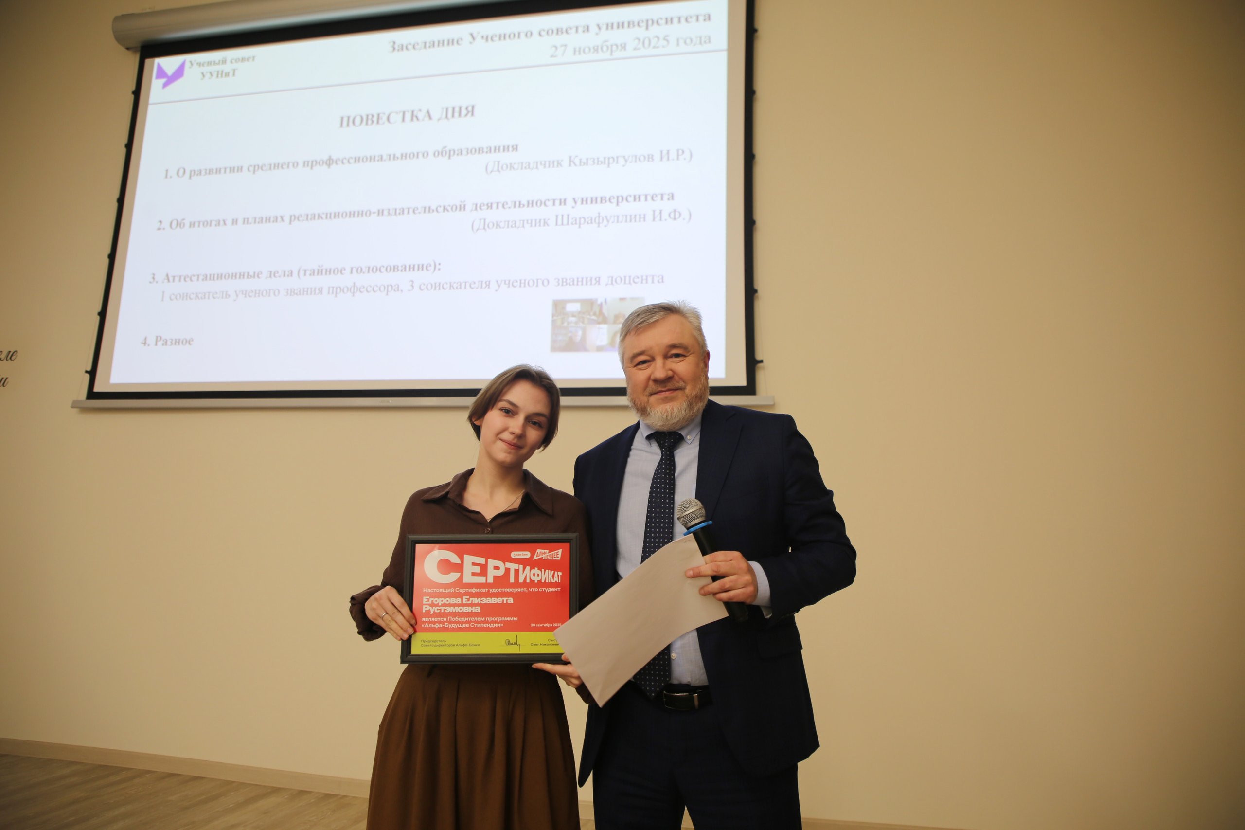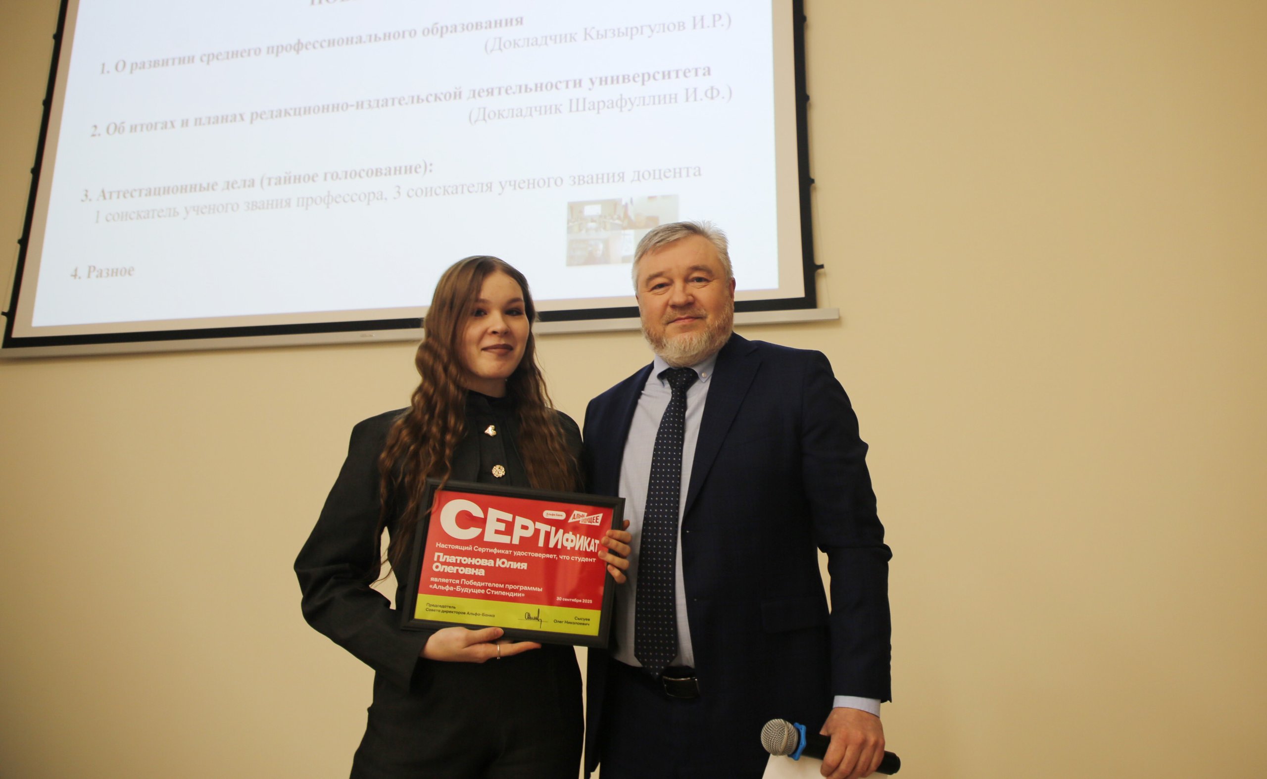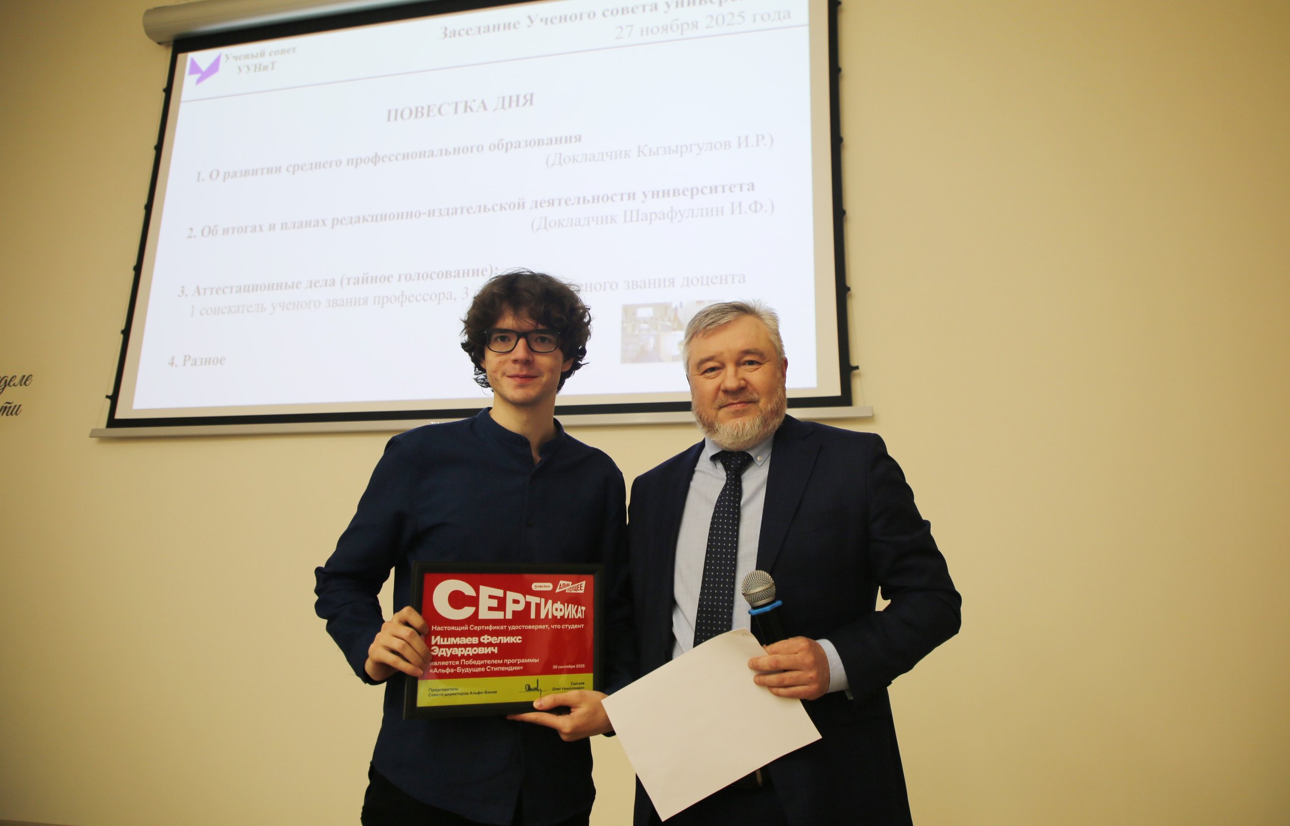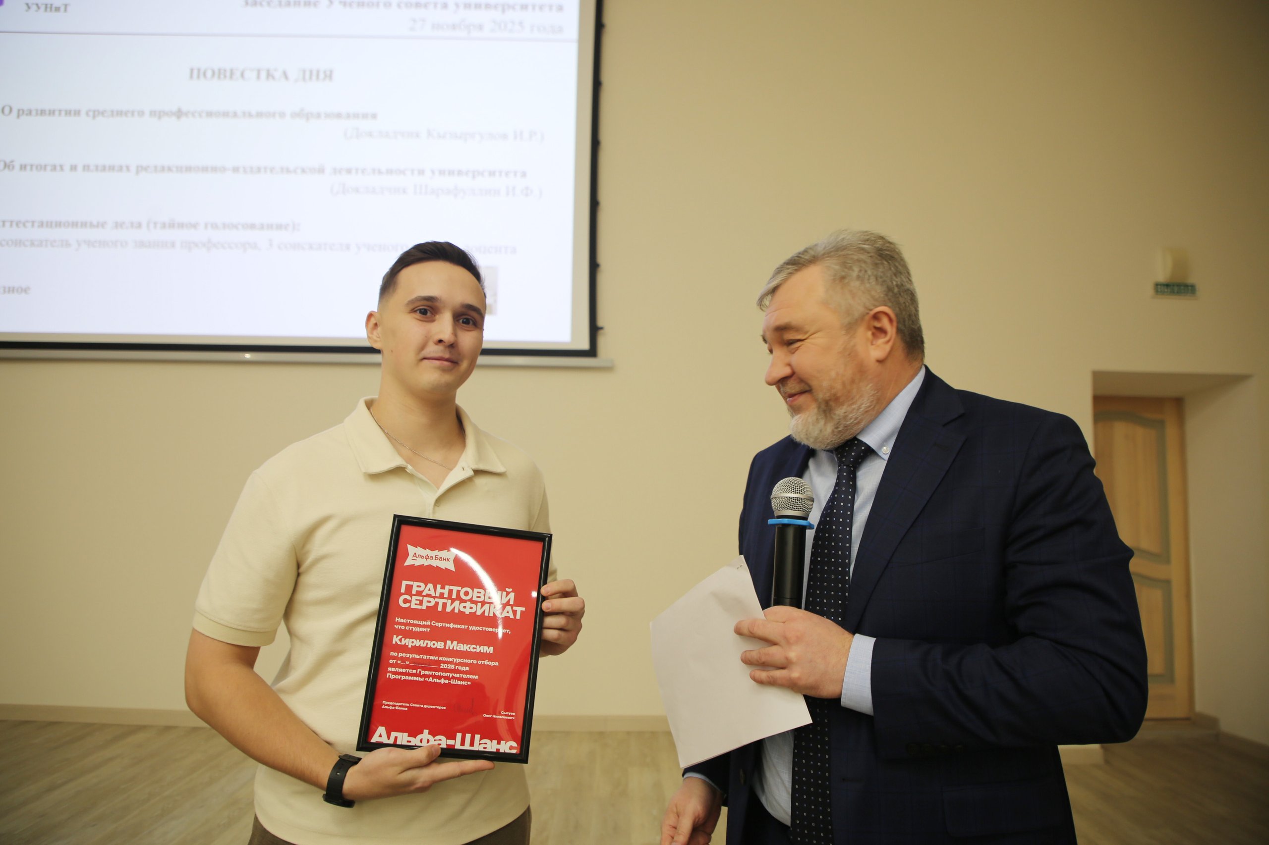 Мероприятие началось с награждения победителей программ «Альфа-Будущее/Стипендии» и «Альфа-Шанс» от АО «Альфа-банк». Сертификаты и памятные подарки талантливым студентам и аспирантам УУНиТ вручил управляющий АО «Альфа-Банк» в Республике Башкортостан Радик Ахметшин. Отметим, что топ-менеджер банка – выпускник нашего университета, также защитивший кандидатскую диссертацию в стенах вуза.