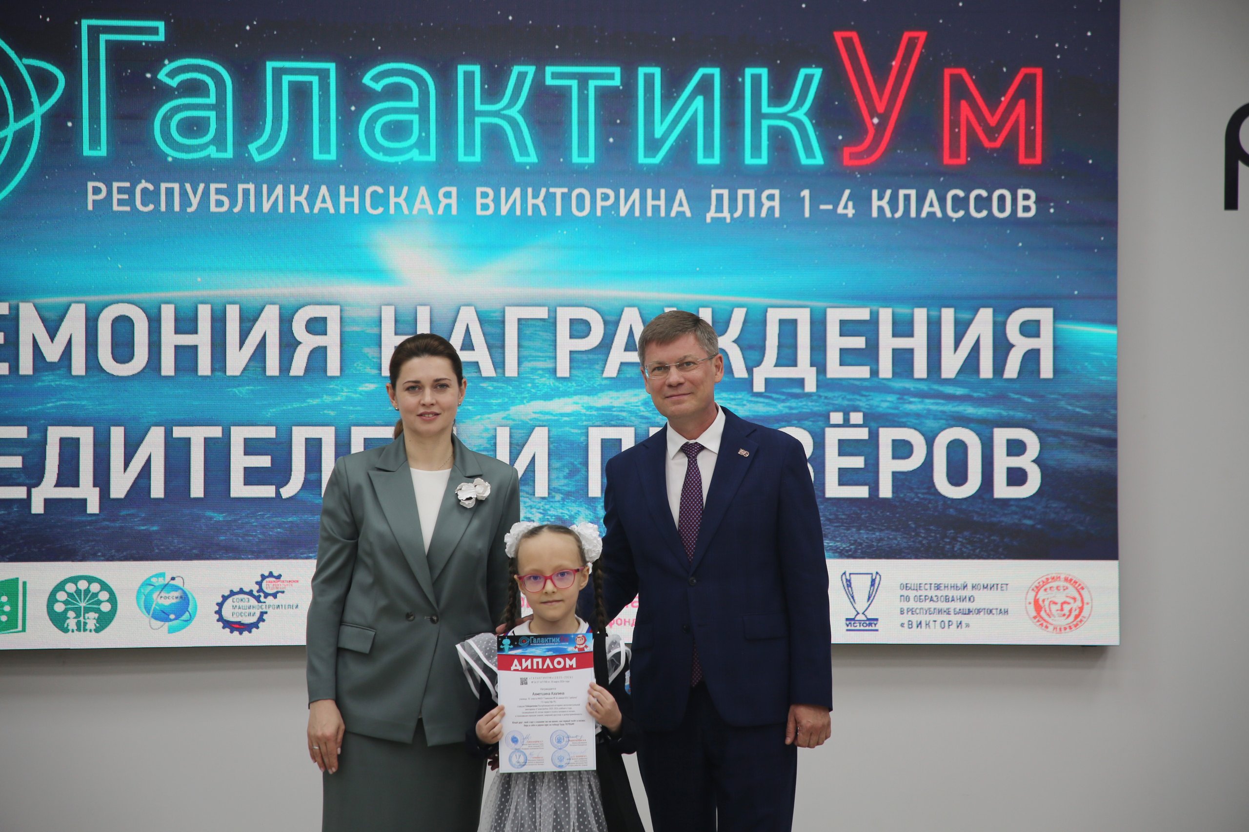 Основные торжества прошли в зале «Траектория», где состоялась церемония награждения победителей Республиканской историко-интеллектуальной викторины «ГалактикУм» для школьников 1–4 классов. Награды юным талантам вручили Каринэ Хабирова, Вадим Захаров, Наталья Никитина, Ирек Сагитов, Руслан Хабибов и Александр Лынник.